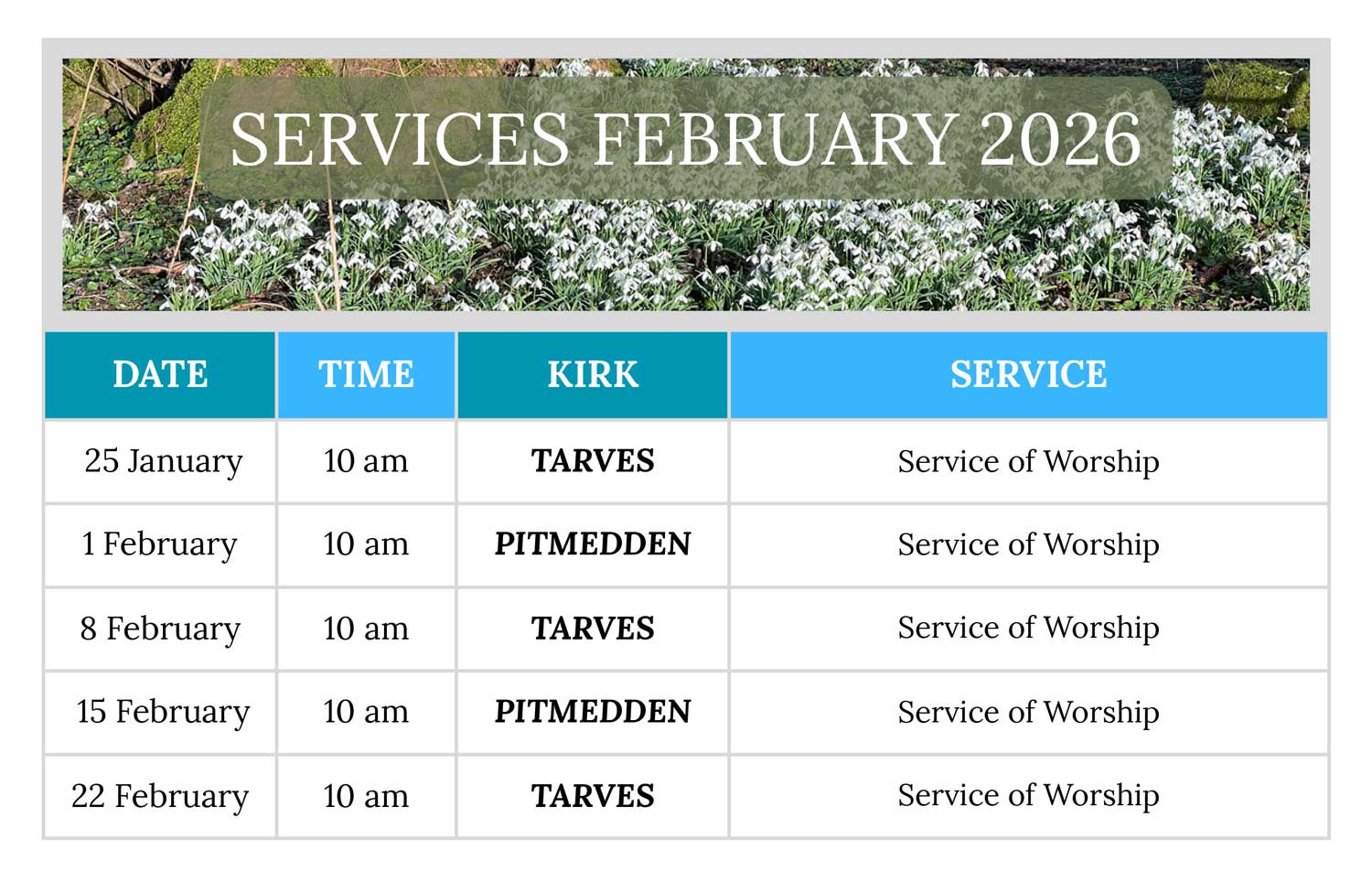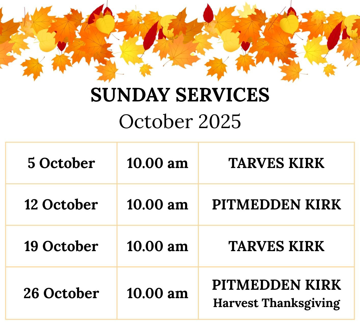 Services of worship are held on Sundays at 10.00 am alternating between Tarves and Pitmedden kirks. Check the calendar for details.